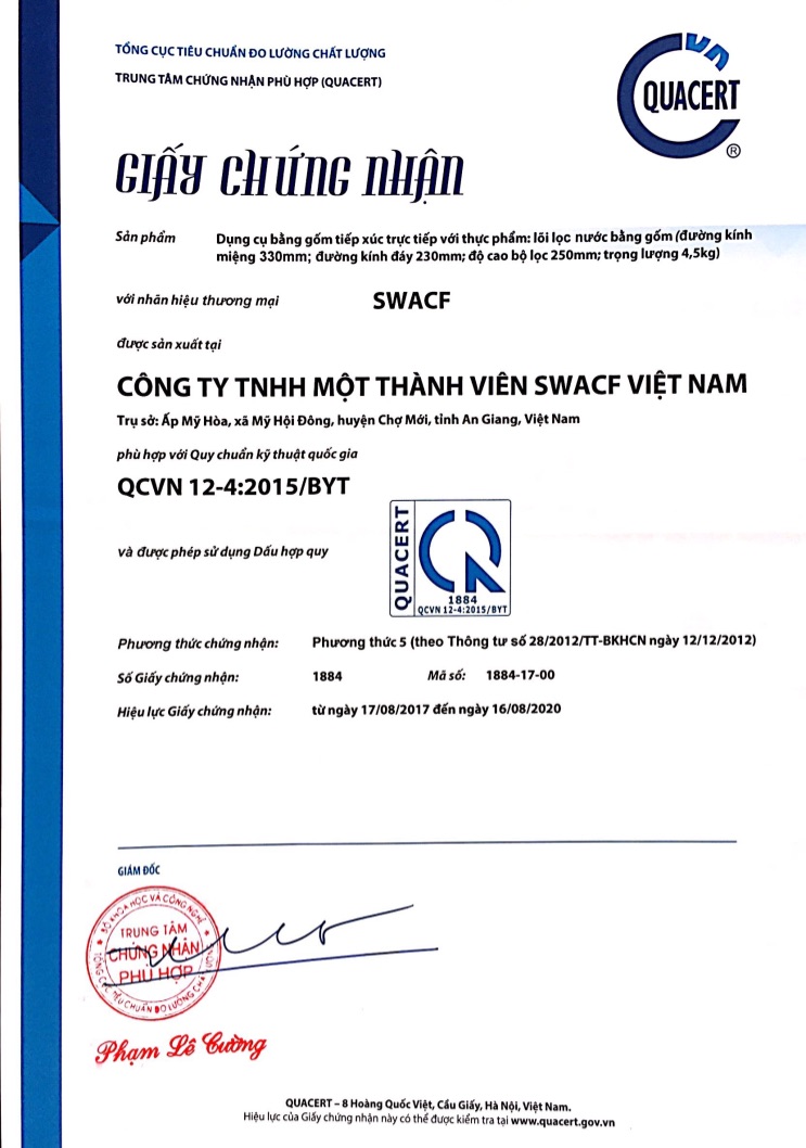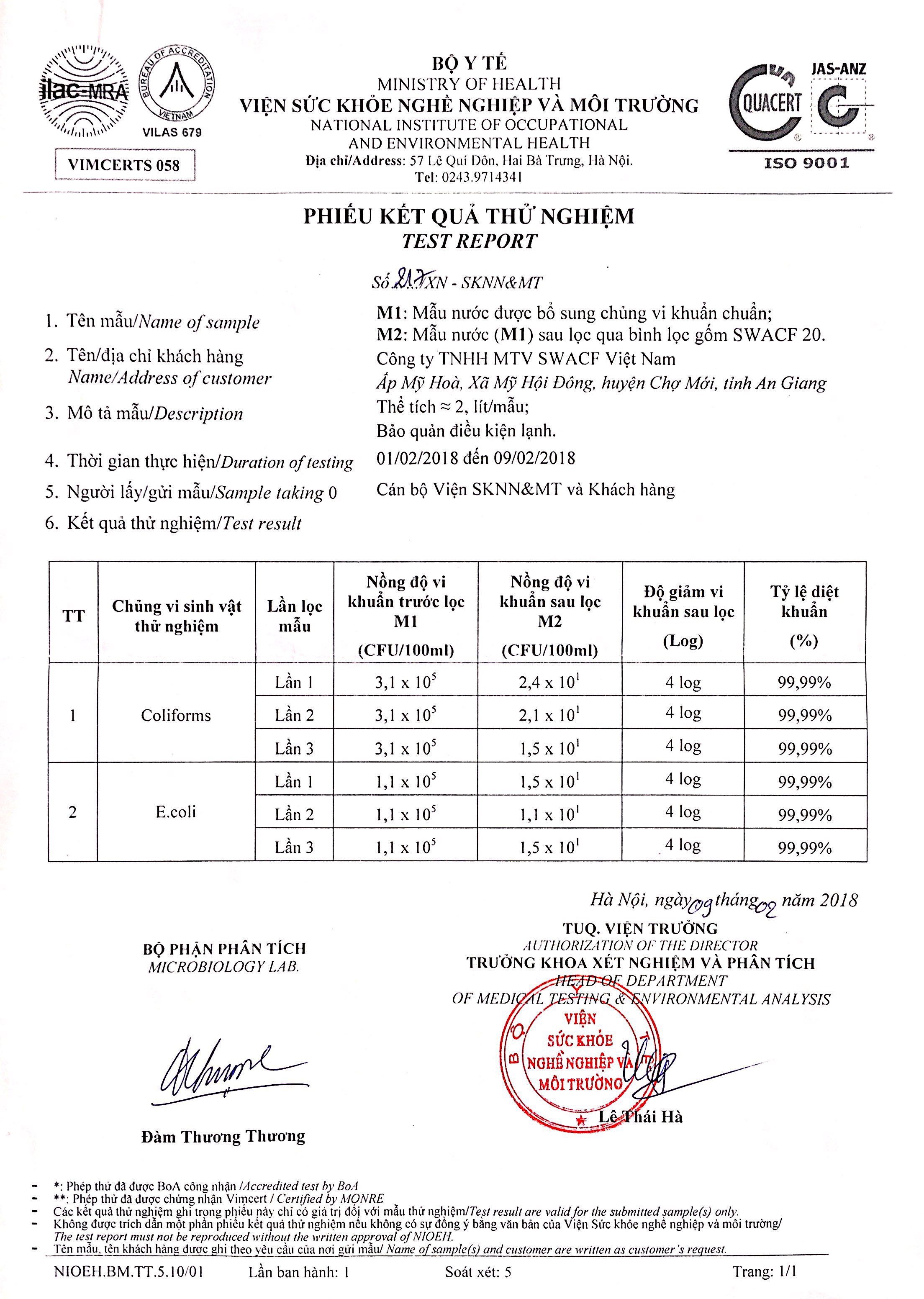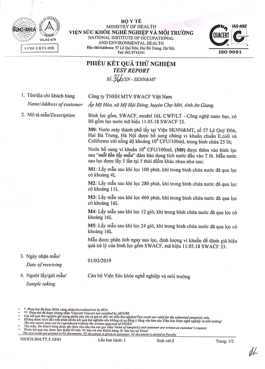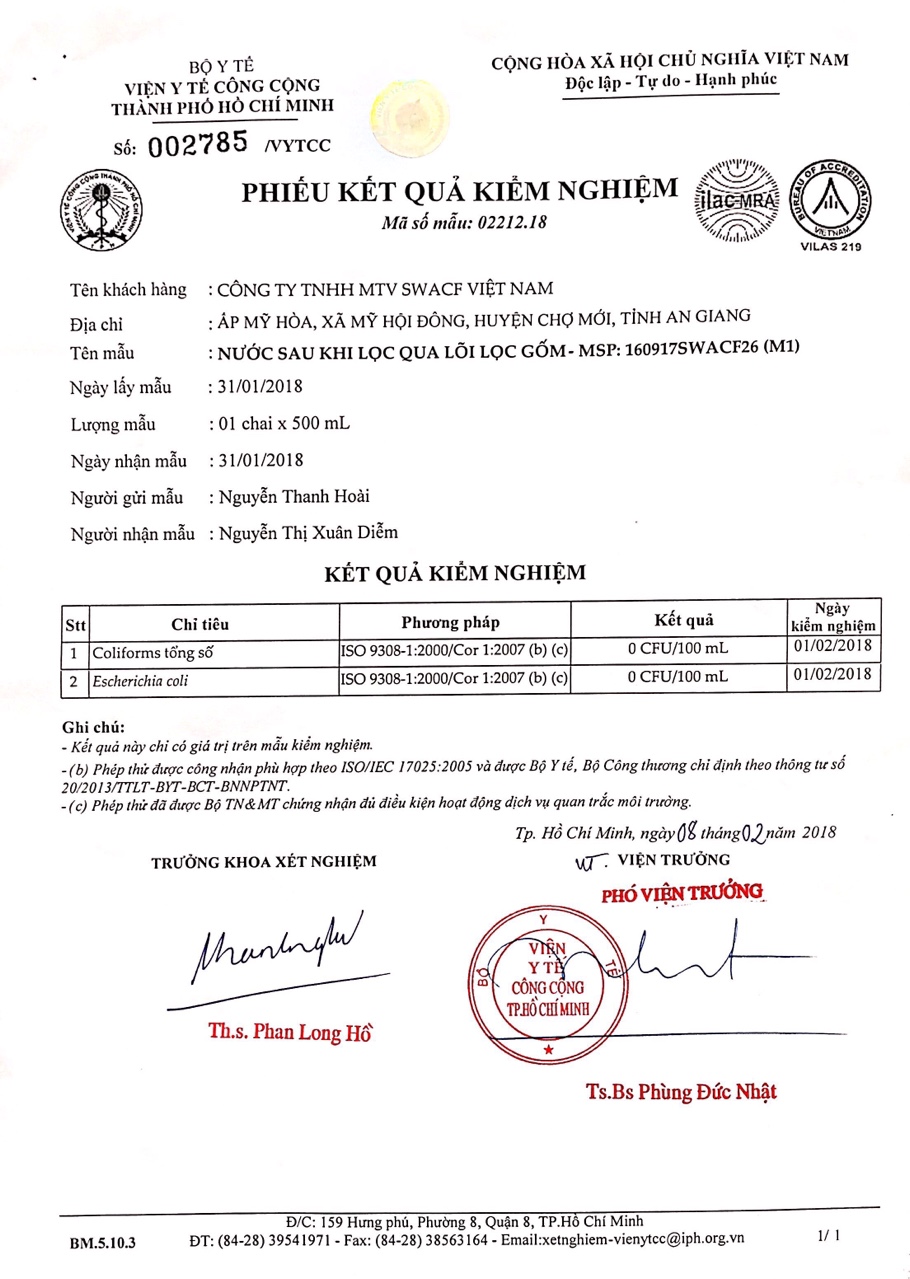 Bình lọc gốm SWACF (Highly Protective) có hiệu quả khử trùng tuyệt đối đạt 99,999% (5log10),  99,9999 (6log10) vi khuẩn e.coli và coliforms sau 12 và 24 giờ tiếp xúc.