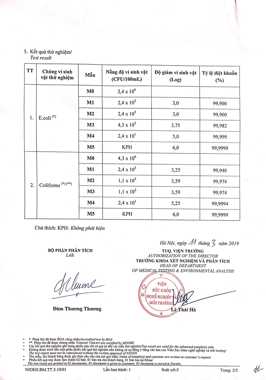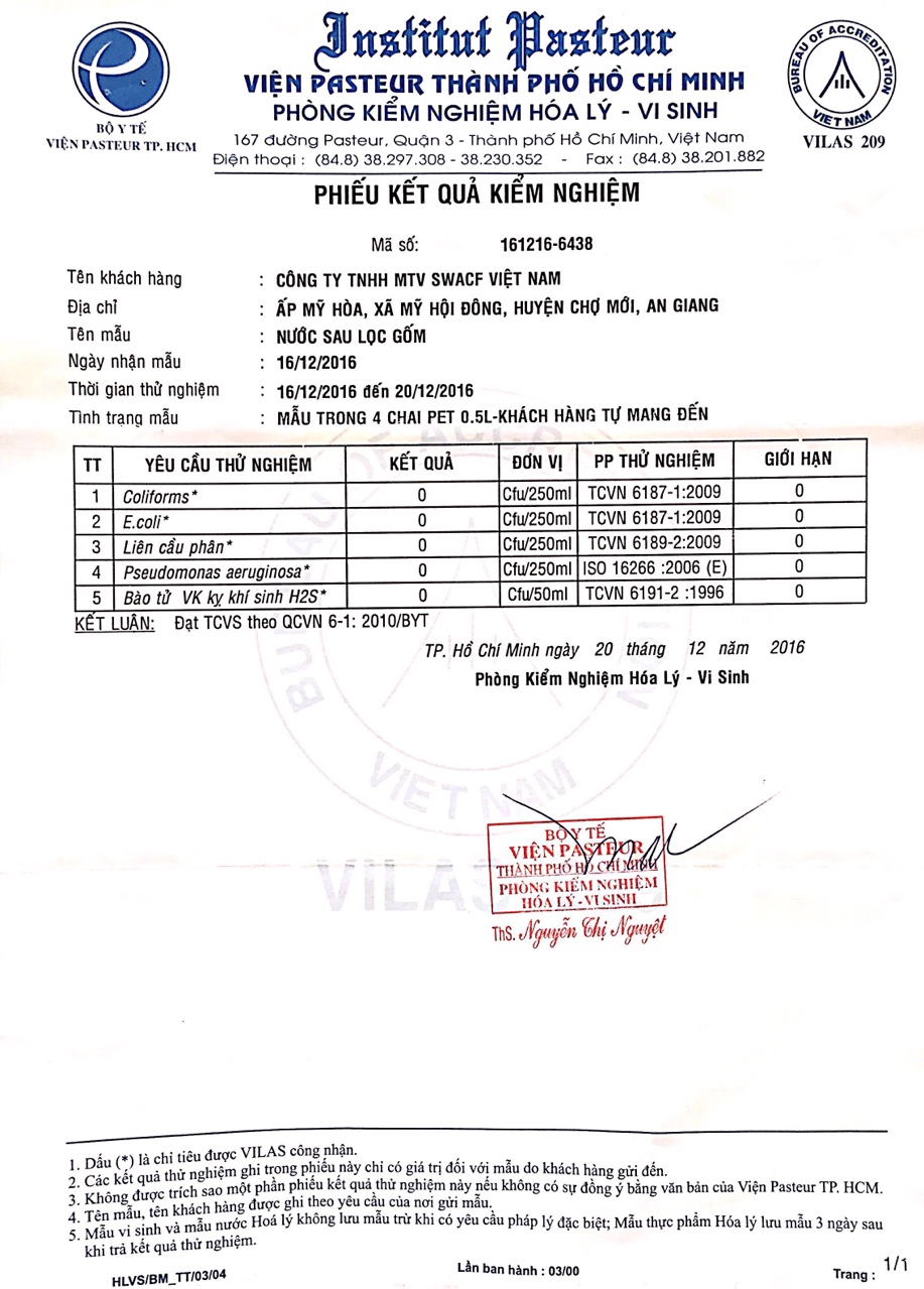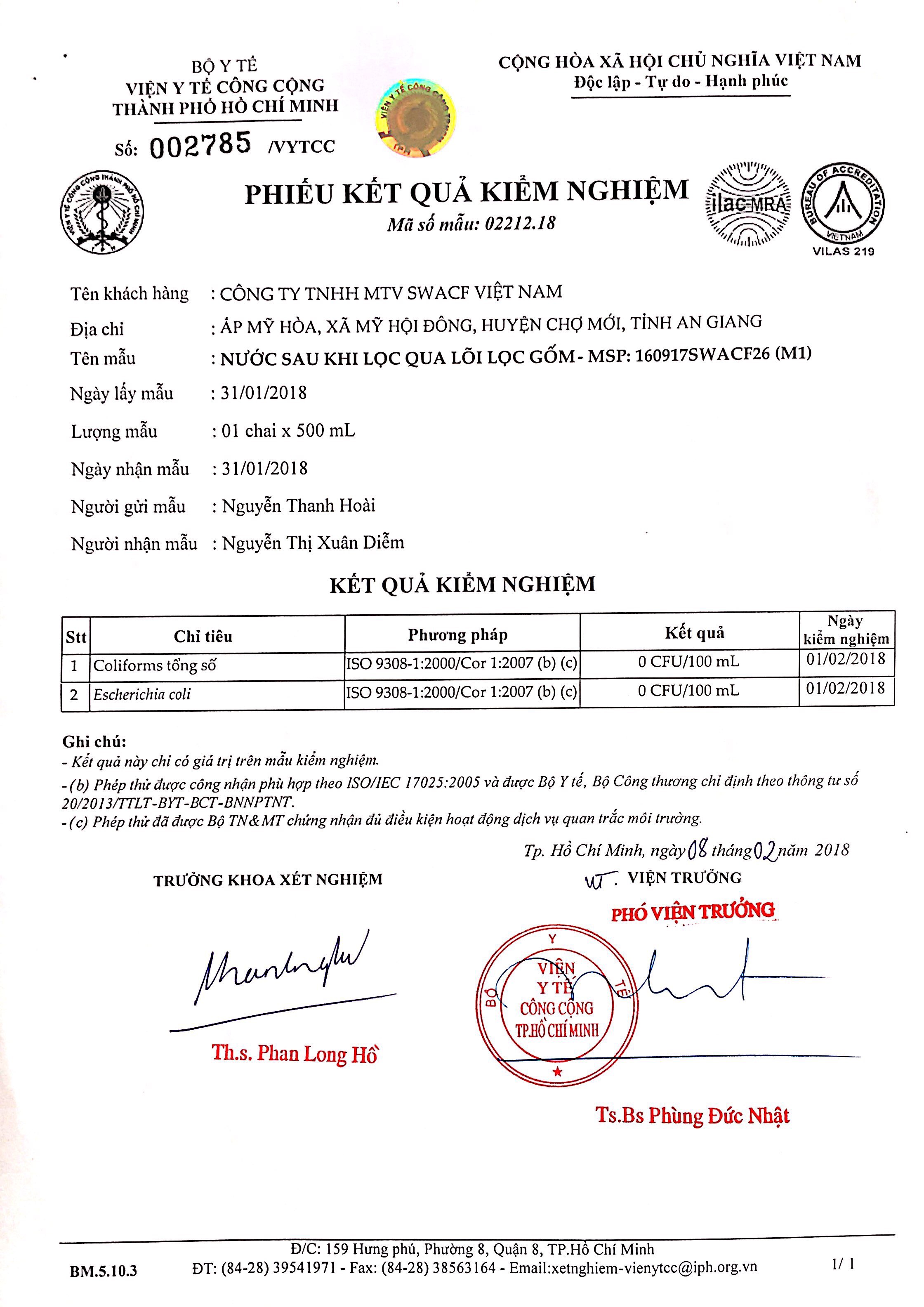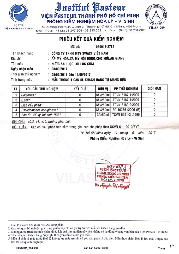 Bình lọc gốm SWACF (Highly Protective) có hiệu quả khử trùng tuyệt đối đạt 99,999% (5log10),  99,9999 (6log10) vi khuẩn e.coli và coliforms sau 12 và 24 giờ tiếp xúc.