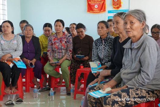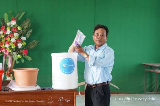 Hoạt động truyền thông bình lọc gốm đang được UNICEF, NCERWASS thực hiện tại vùng dự án nơi các hộ gia đình nông thôn, những người chịu ảnh hưởng bỡi cơn bão Damrey.